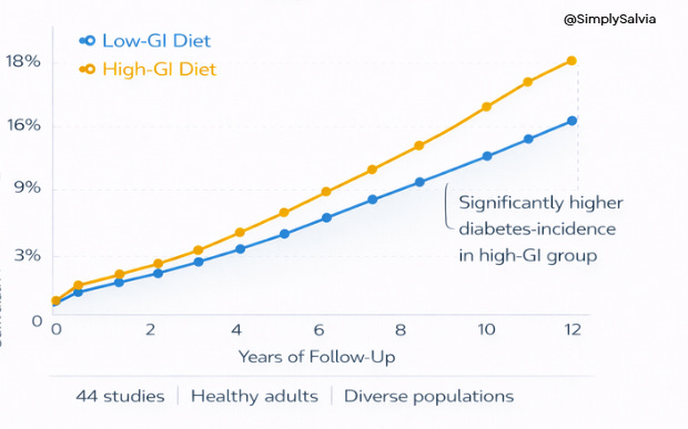 A systematic review and dose–response meta-analysis of prospective cohort studies found a clear gradient: as dietary GI and GL increased, so did the risk of developing type 2 diabetes. Each incremental rise in glycemic exposure corresponded to higher disease risk, suggesting cumulative harm rather than a threshold effect. Mechanistically, diets dominated by rapidly absorbed carbohydrates create repeated glucose and insulin excursions that, over time, promote insulin resistance and beta-cell stress.