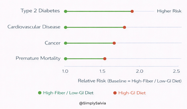 In a complementary meta-analysis pooling data from several large prospective cohorts, the same research group examined how glycemic quality relates to broader health outcomes. Diets high in GI or GL were associated not only with type 2 diabetes, but also with higher risk of cardiovascular disease, diabetes-related cancers, and all-cause mortality. The pattern suggests that repeated glucose and insulin fluctuations may contribute to metabolic stress, vascular dysfunction, and inflammation, pathways shared across chronic diseases.Glycemic Quality, Fiber, and Long-Term Health Outcomes
