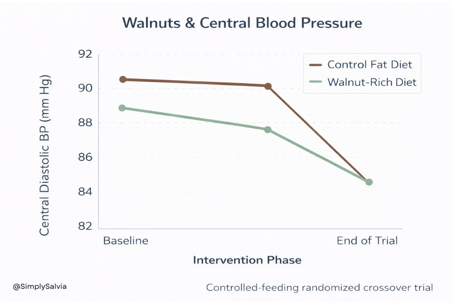 A controlled-feeding randomized crossover trial compared a walnut-rich diet with matched diets using other fats and oils. While standard arm blood pressure readings didn’t change dramatically, something more subtle did.