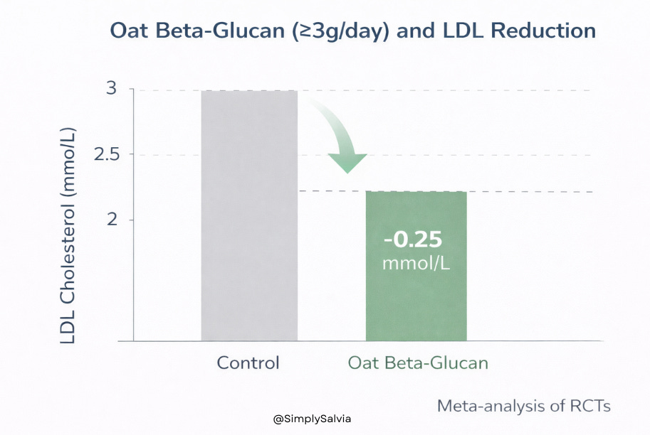 Across studies, LDL cholesterol fell by about 0.25 mmol/L, with total cholesterol dropping by roughly 0.30 mmol/L, compared with control diets. These effects were consistent enough to reinforce what’s long been suspected: beta-glucan binds bile acids in the gut, prompting the liver to pull more cholesterol from circulation to replace them.