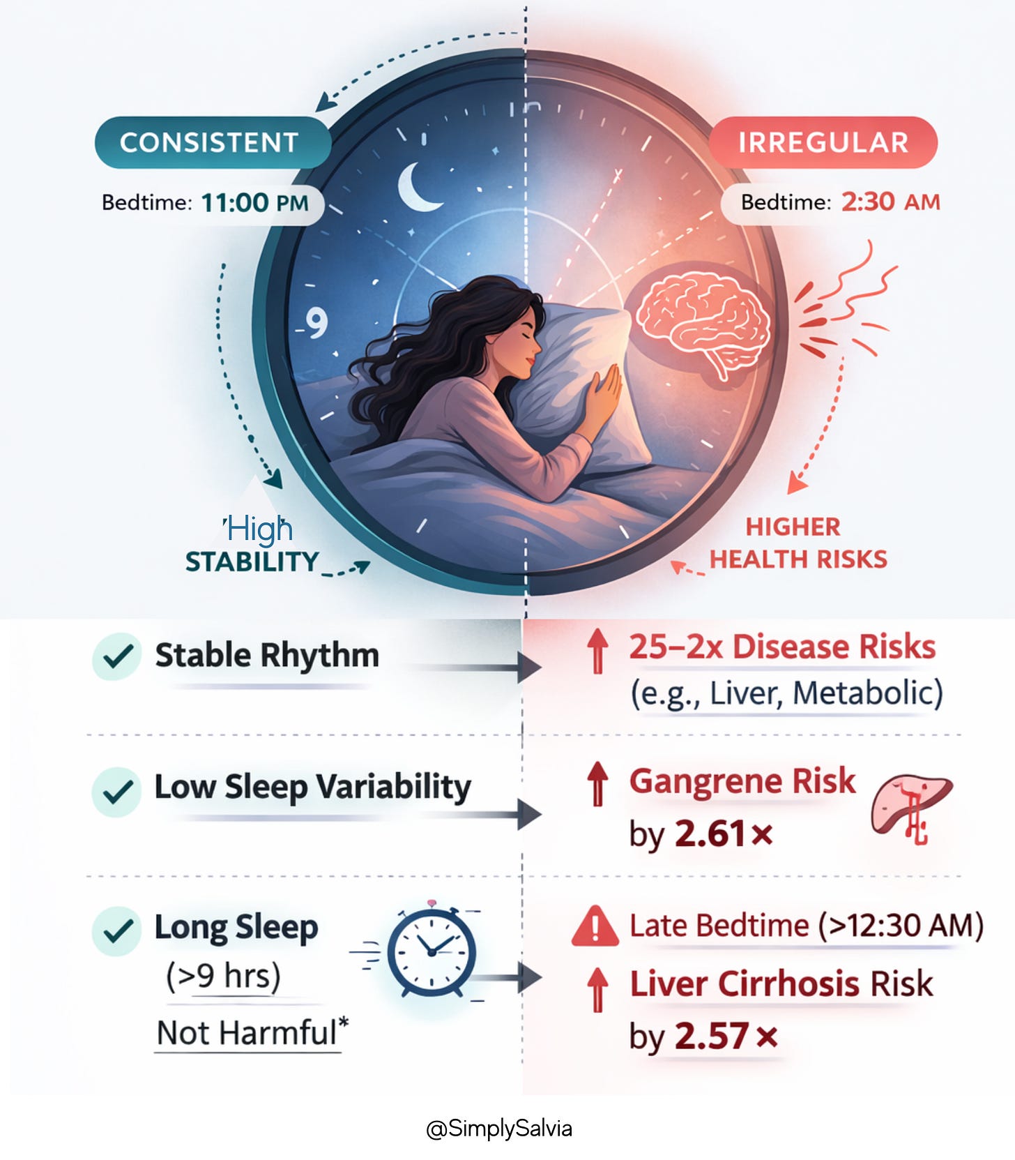 In the largest study of its kind, researchers analyzed sleep tracker data from over 88,000 UK Biobank participants and looked for links to disease. What they found was striking: irregular sleep patterns especially inconsistent bedtimes were linked to higher risks of 172 diseases.