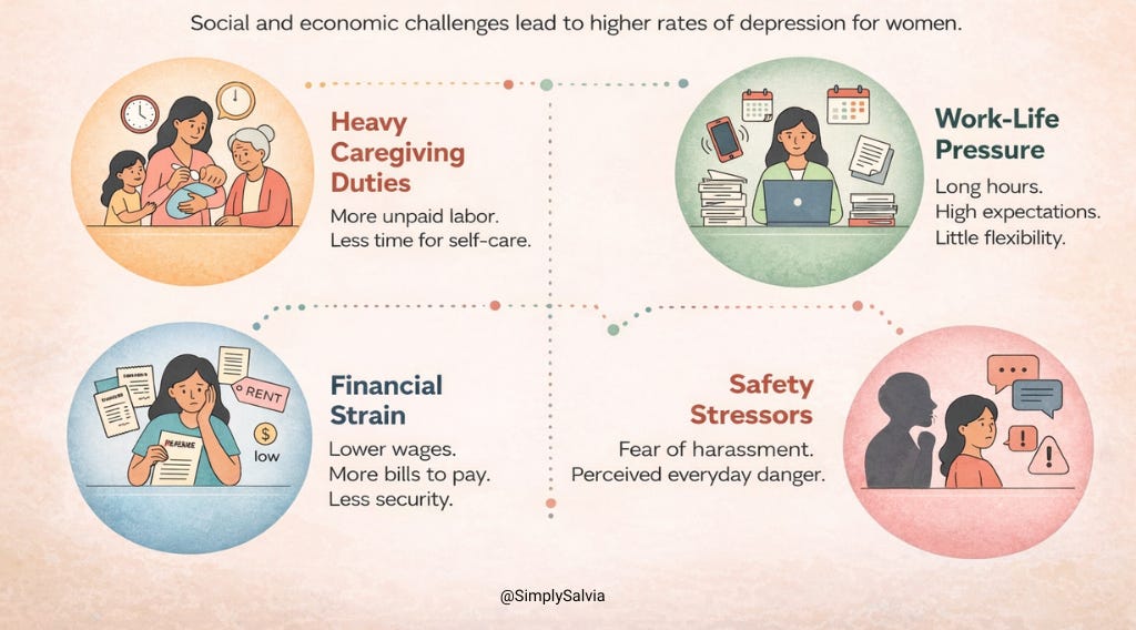 According to the World Health Organization, depression affects about 6% of women and 4% of men globally, a 50% higher prevalence in women. But this gap isn’t only hormonal or psychological—it’s structural.