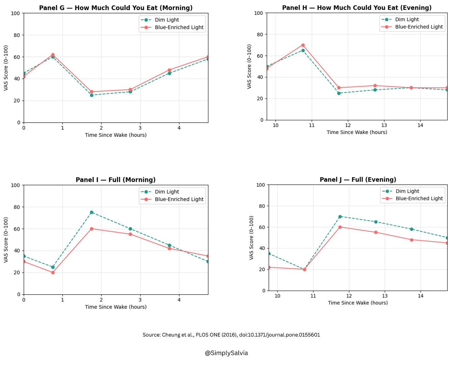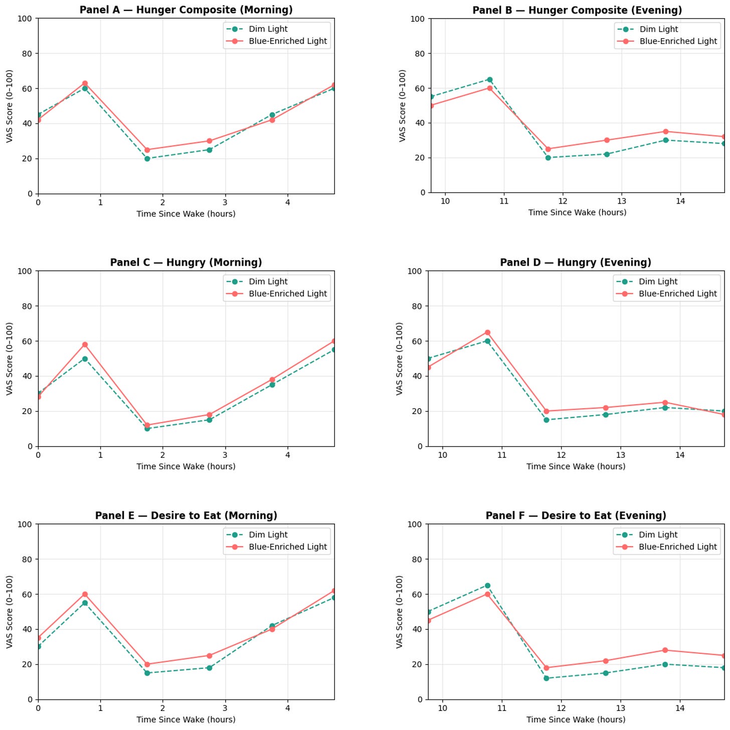 Researchers had 19 healthy adults eat identical meals while exposed to either dim light (under 20 lux) or blue-enriched light (~260 lux), which mimics the kind of light emitted by phones, tablets, and LED screens. The sessions were done in both the morning and evening to test time-of-day effects.