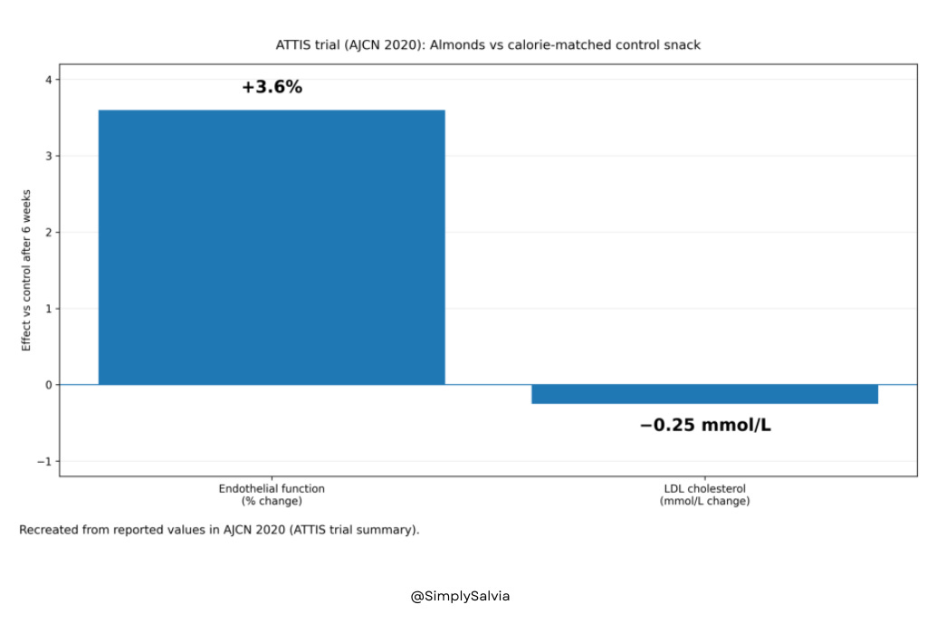 In the ATTIS Trial, published in the American Journal of Clinical Nutrition (2020), researchers followed adults aged 30–70 who were at moderate cardiovascular risk. For six weeks, participants replaced about 20% of their daily calories with either whole roasted almonds (roughly 1.5–2 ounces a day) or a calorie-matched control snack that contained no nuts.