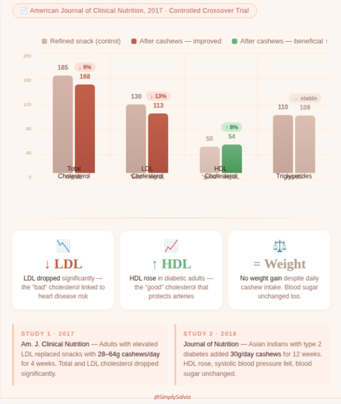 Both studies emphasize the same principle: when we replace refined carbs with nutrient dense plant fats, lipid quality improves. Cashews don’t just add calories; they subtly shift the metabolic environment in favor of cardiovascular health.
