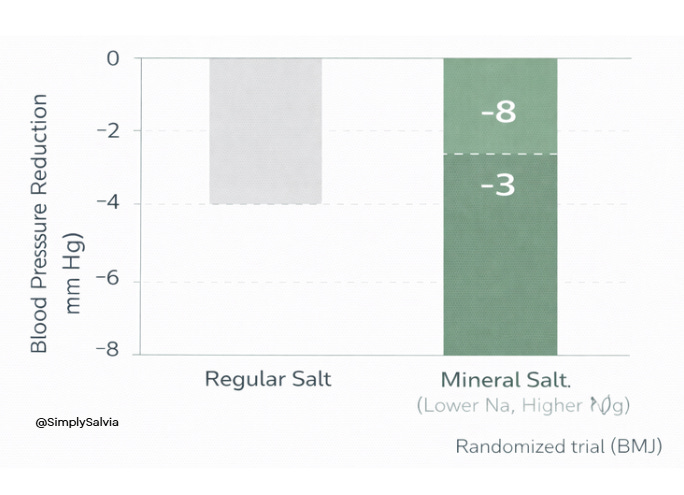 Over the study period, systolic blood pressure fell by about 8 mmHg and diastolic by about 3 mmHg. Importantly, participants didn’t overhaul their diets. The main change was the sodium–potassium–magnesium balance of the salt itself.