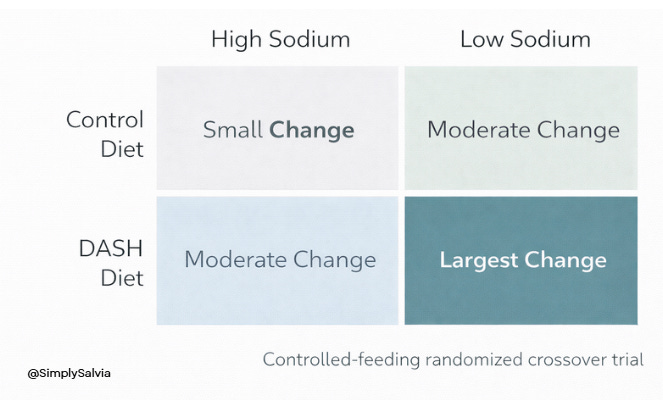 What mattered most wasn’t sodium alone. The largest blood pressure reductions occurred when low sodium was combined with the DASH diet, which intentionally raises potassium, magnesium, calcium, fiber, and protein.