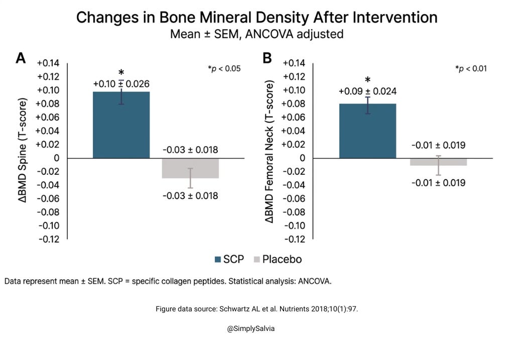 In a year-long randomized, double blind, placebo controlled trial published in Nutrients (2018), 131 postmenopausal women with low bone mineral density took 5 g/day of specific collagen peptides or a placebo. After 12 months, the collagen group showed significant increases in bone mineral density at both the lumbar spine and femoral neck compared with placebo.