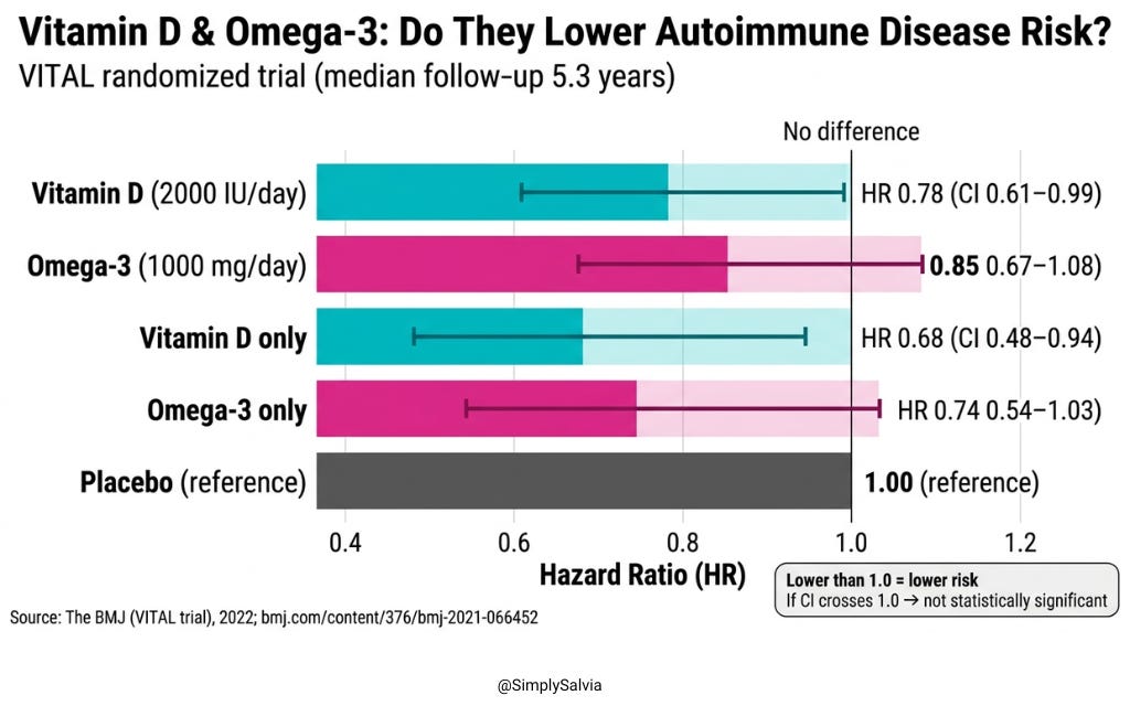 The VITAL trial, published in the BMJ (2022), followed 25,871 U.S. adults (men ≥50, women ≥55) for over five years to test whether vitamin D₃ (2,000 IU/day) and marine omega 3s could prevent new autoimmune diseases.