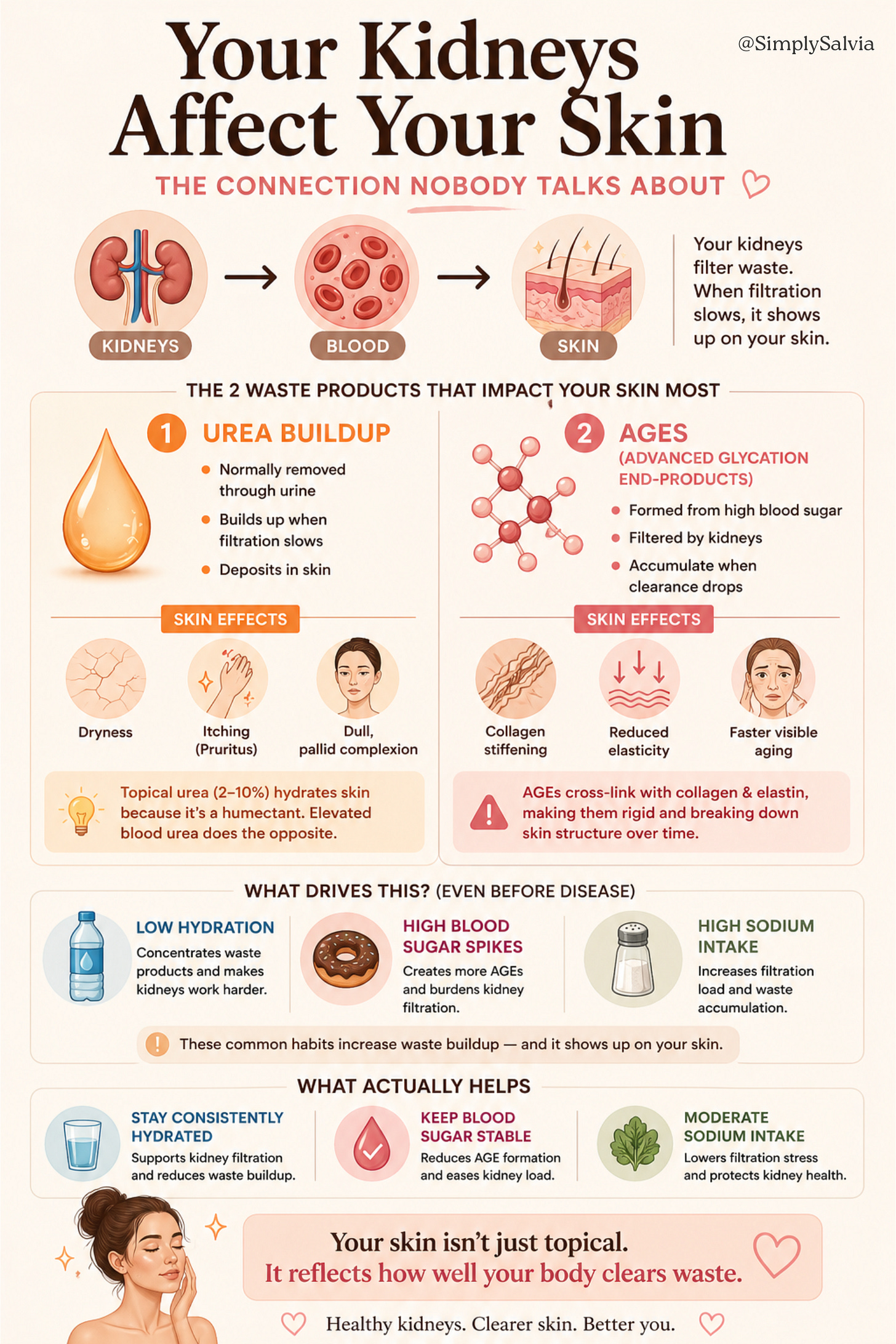For a young, healthy person this isn’t about kidney disease. It’s about the factors that affect kidney function subclinically: chronic dehydration (which concentrates waste products), consistently high blood glucose (which accelerates AGE formation and burdens kidney filtration), and high sodium intake (which increases the filtration load). All three are common in typical diets and all three have measurable effects on skin appearance through the kidney pathway.
