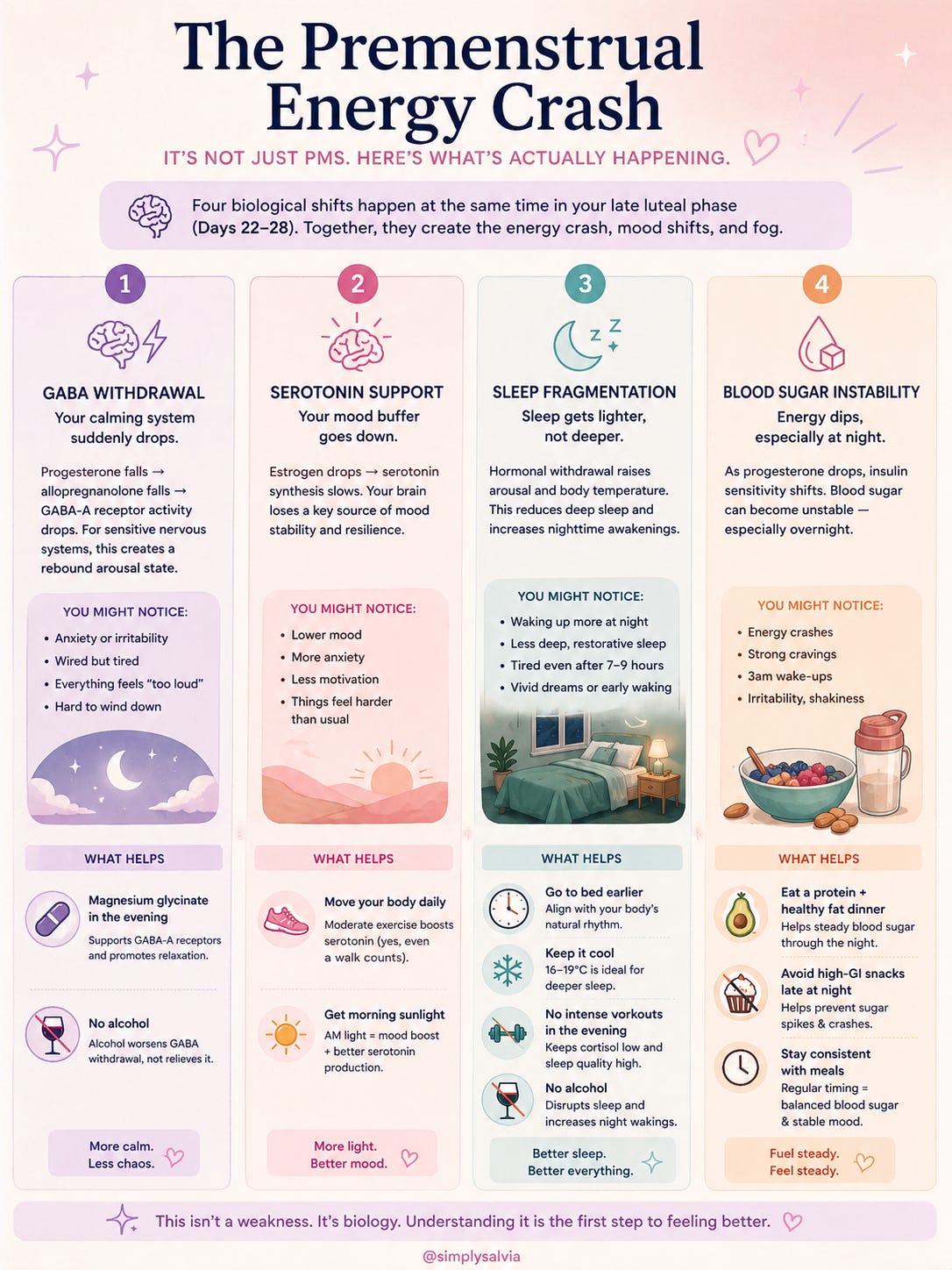 Understanding this combination explains why the typical advice “take ibuprofen for the cramps, it’ll pass,” doesn’t address most of what’s happening. The fatigue, anxiety, insomnia, and cognitive difficulty of the late luteal phase are driven by four specific biological mechanisms that respond to four different interventions: