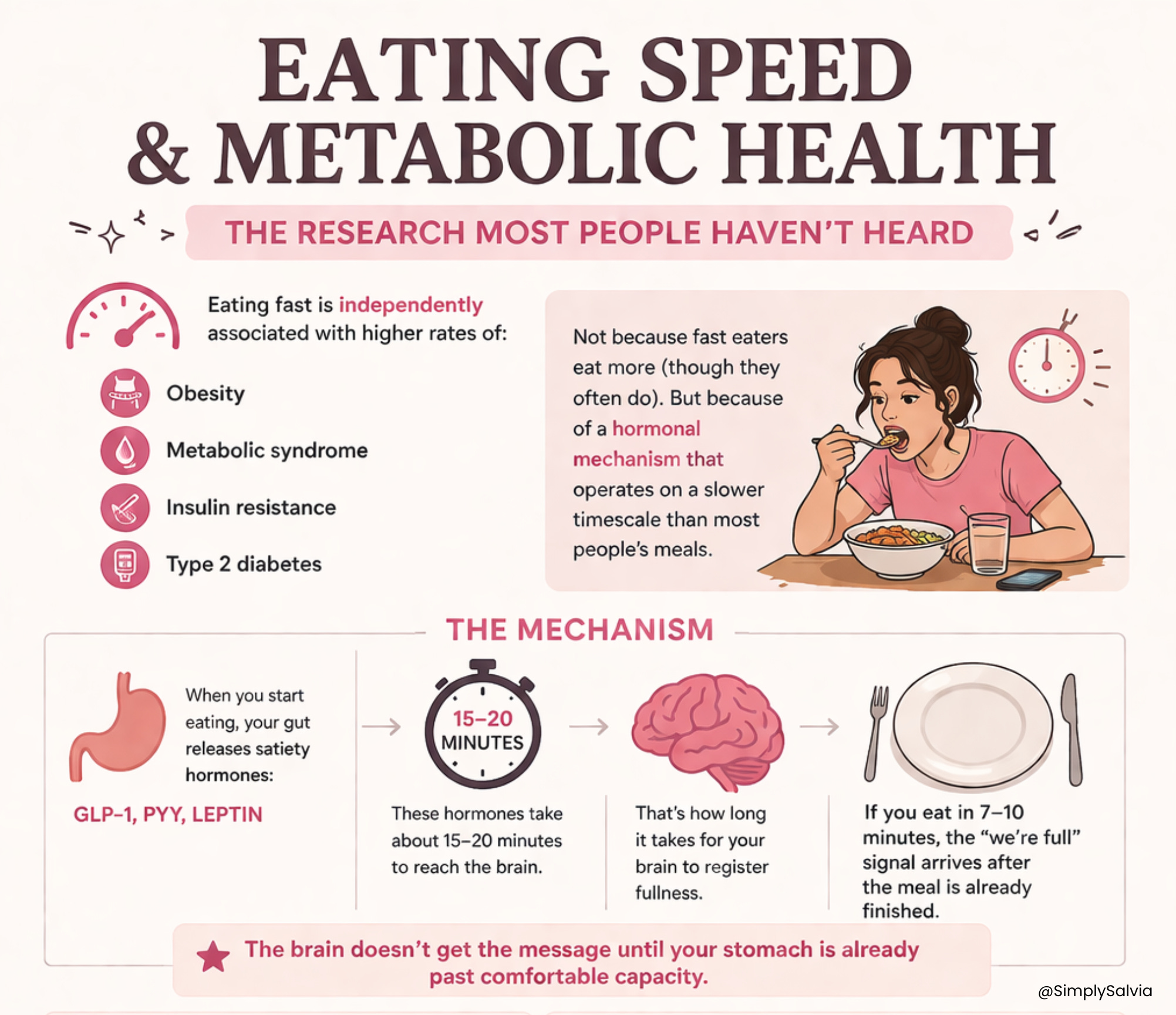 Eating speed — specifically, eating fast is independently associated with higher rates of metabolic syndrome, obesity, insulin resistance, and type 2 diabetes. Not because fast eaters eat more (though they often do, more on that). But because of a hormonal mechanism that operates on a slower timescale than most people’s meals.