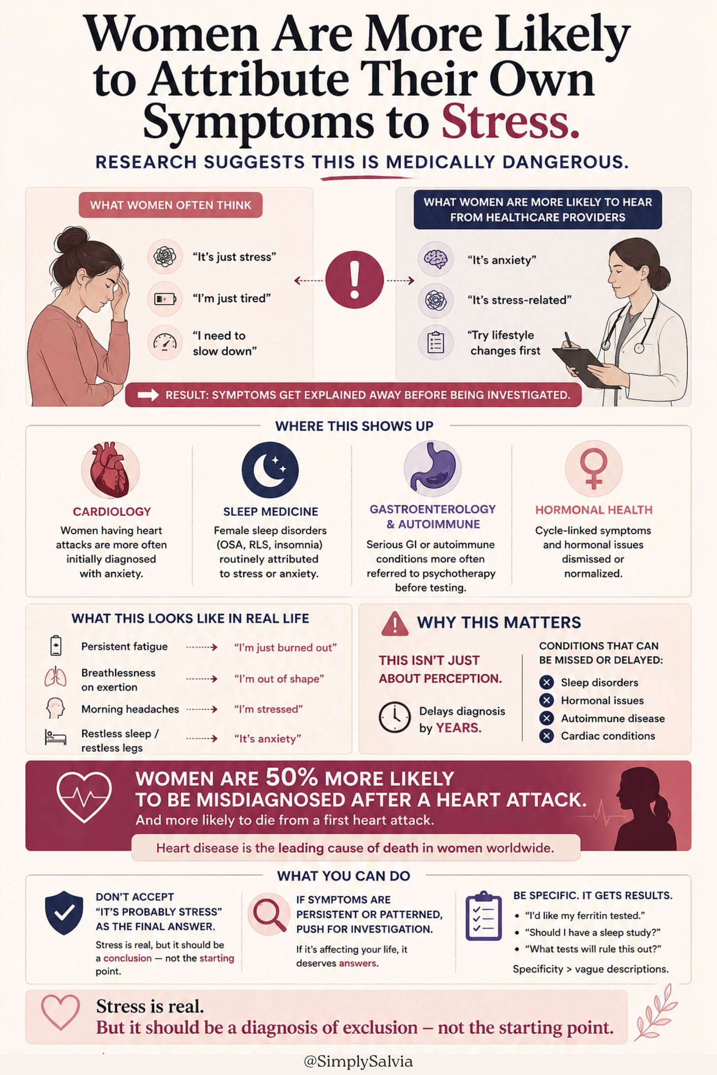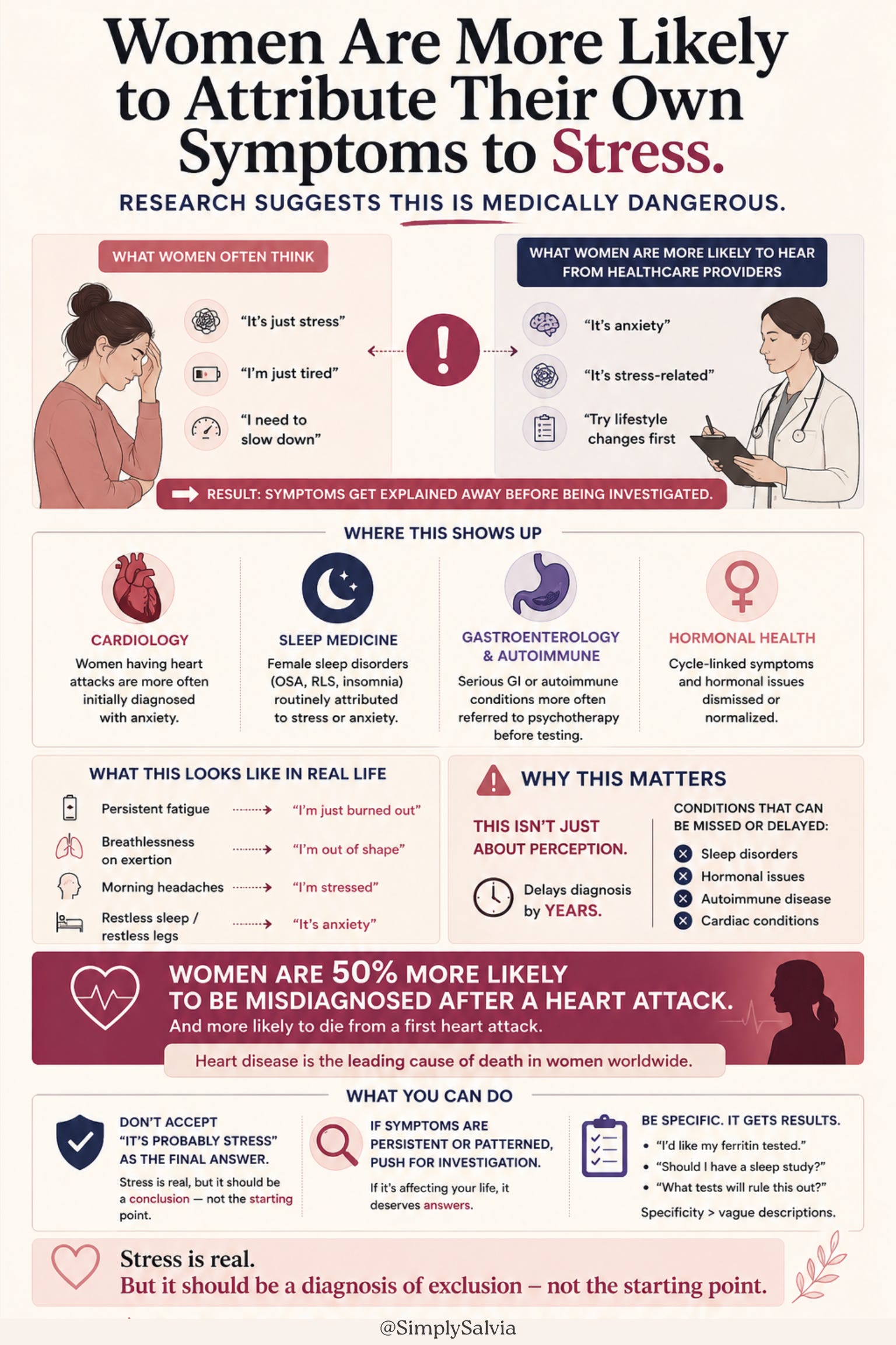 The medical recommendation that emerges from this data, and I want to be direct about it — is: do not accept “it’s probably stress” as the conclusion of an investigation unless investigations have actually been done. Stress is a real and common contributor to many symptoms. It is also a default explanation that, in female patients, has been documented to delay the diagnosis of conditions including autoimmune disease, cardiac conditions, sleep disorders, and hormonal pathologies by years and sometimes decades.
