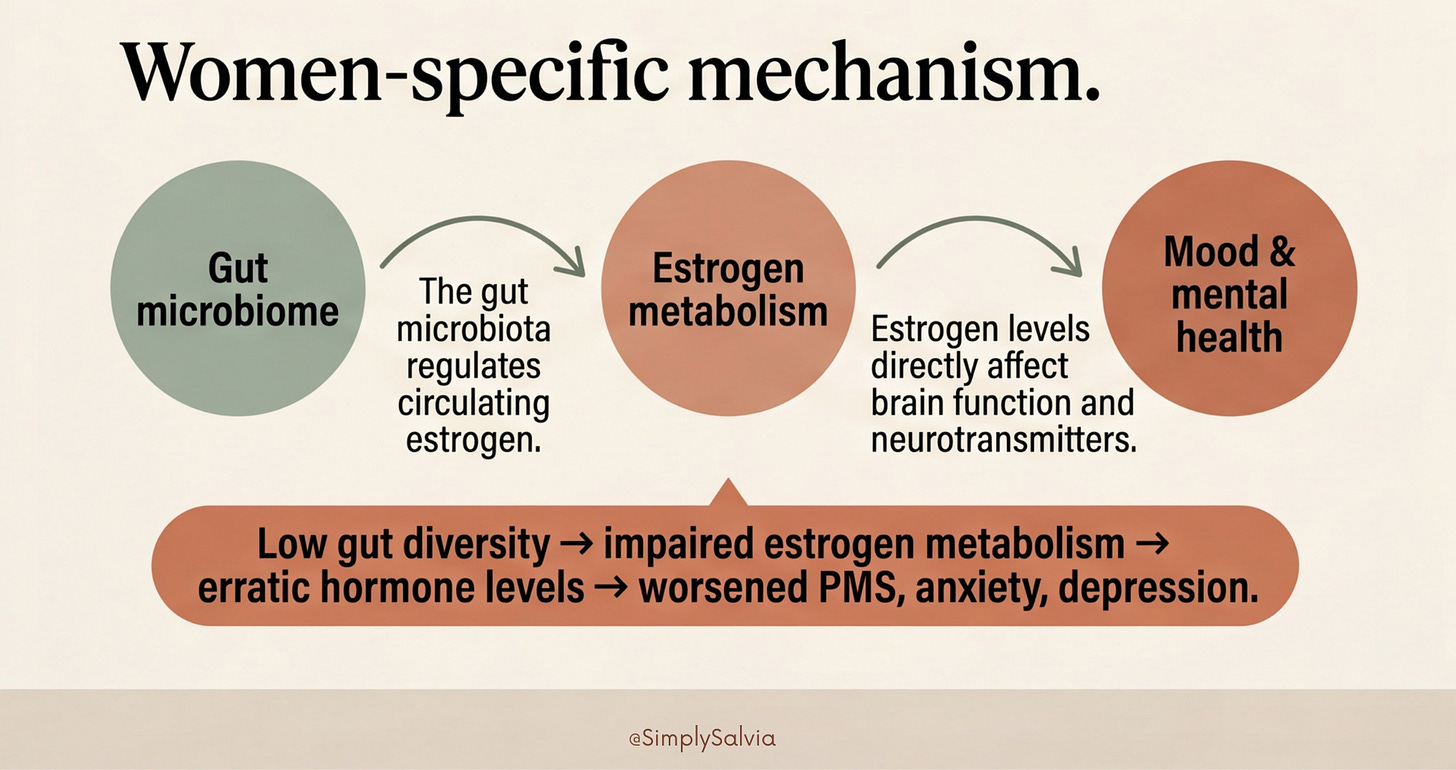 What makes this specifically a women’s health story rather than a general one: female hormones and the gut microbiome have a two-way relationship. Estrogen is metabolised partly in the gut by a set of bacteria collectively called the “estrobolome.” When gut diversity is low, estrogen metabolism is impaired, and circulating estrogen levels become more erratic. This worsens premenstrual symptoms, disrupts the hormonal balance of the cycle, and the research is now suggesting that it directly affects mood and anxiety through gut-brain pathways.