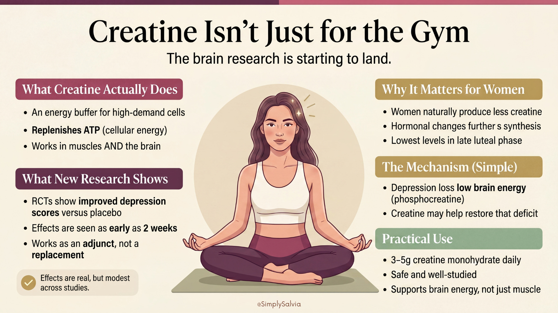 What the evidence is not saying: creatine is not an antidepressant, and a November 2025 meta-analysis in the British Journal of Nutrition found the overall effect on depressive symptoms to be below the clinical relevance threshold across studies meaning the average effect is real but modest. It’s not replacing therapy or medication. It’s an adjunct with a plausible mechanism and an accumulating evidence base, in a population (women) that has been almost entirely absent from the research until very recently.