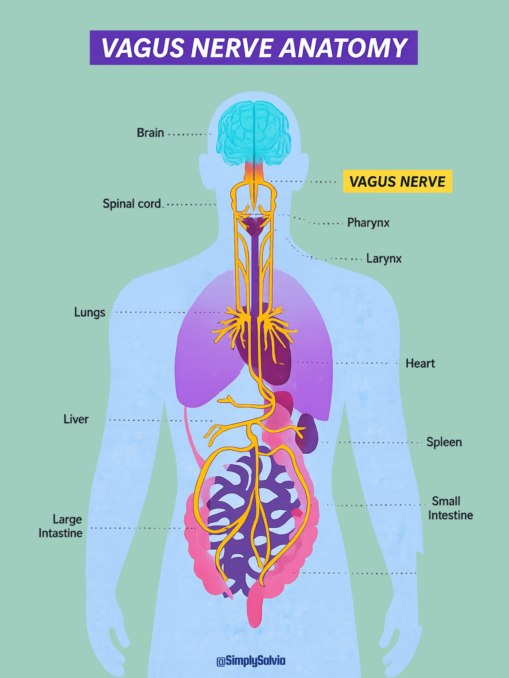 The vagus nerve is at the centre of the emerging science on how to regulate this. It is the longest cranial nerve in the body, running from the brainstem to the abdomen and connecting most of the major organs along the way. It is the primary nerve of the parasympathetic system aka the rest and digest counterpart to fight or flight. Decades of research have established a critical role for vagus nerve signalling in emotional regulation, cognitive performance, inflammation response, and physical recovery.