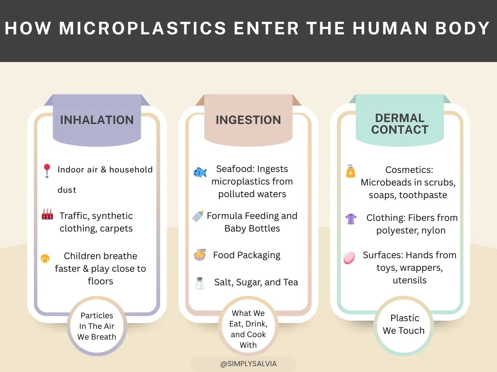 We are at the beginning of understanding what this means. The mechanisms are not fully mapped, and researchers are cautious about drawing firm conclusions from what is still an emerging field. What is clear is that microplastics primarily enter the body through ingestion, inhalation, and skin contact, with traces now found across a broad range of human tissues and biological fluids. The exposure is ongoing. It is not avoidable, but it is reducible: glass or stainless steel water bottles over plastic, not microwaving food in plastic containers, swapping synthetic clothing for natural fibres where possible. These are not solutions. But they matter at the margins, and the margins are where individual exposure can be reduced while the larger regulatory and industrial questions are fought out.