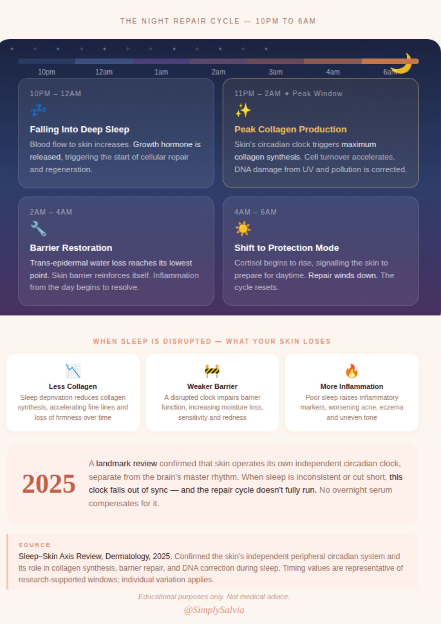 → Your skin repairs itself at night — collagen builds, cells renew, damage corrects but only if your sleep is regular and your circadian rhythm is intact. Disrupted sleep structurally ages skin over time.
