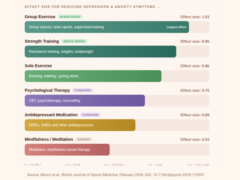 → Exercise is a genuinely powerful treatment for depression and anxiety, with effects comparable to therapy and medication, especially for young adults. The evidence now supports prescribing it with the same confidence.