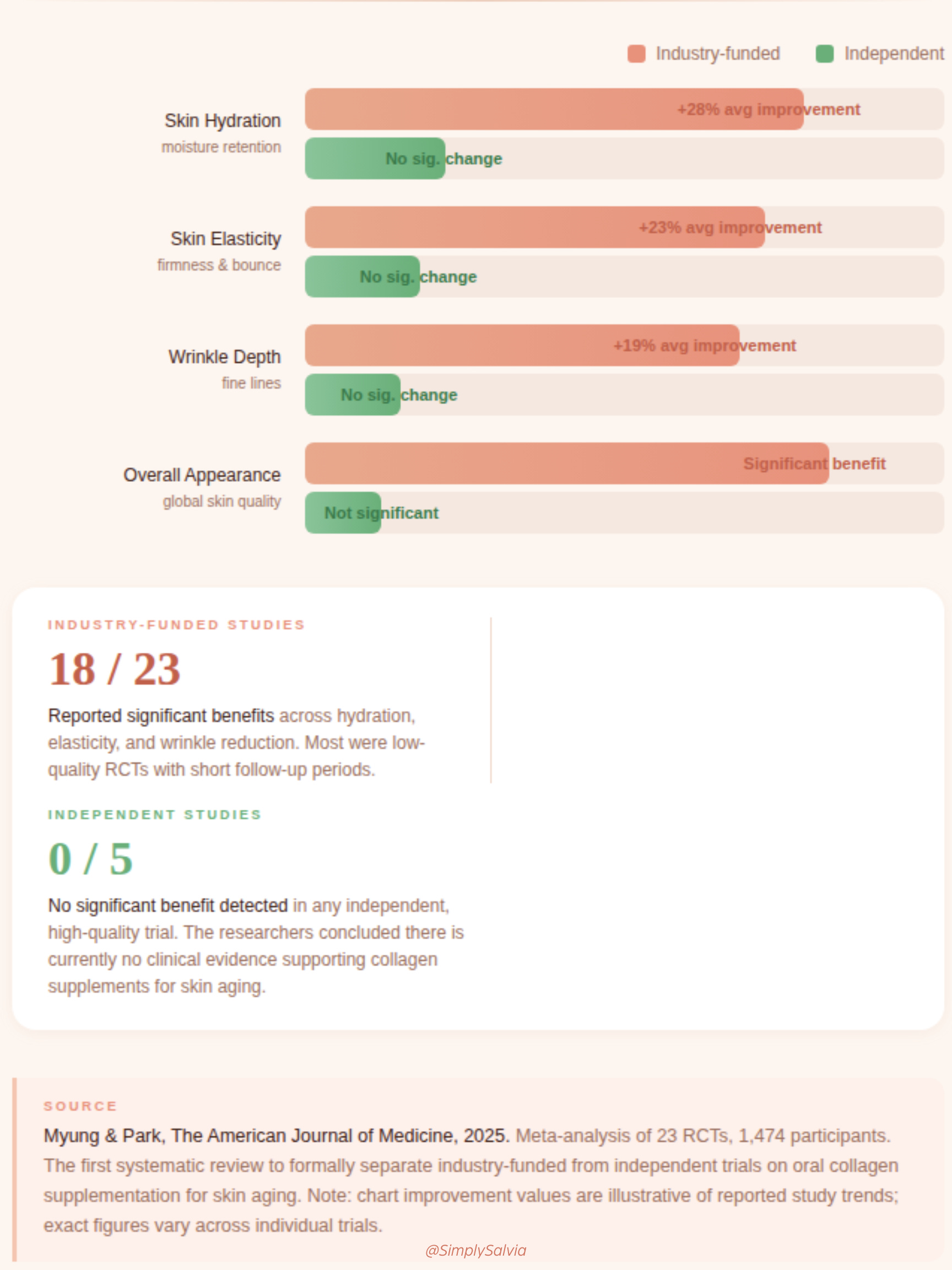 → The collagen supplement industry is running ahead of the independent science. The studies showing benefits are predominantly funded by the companies selling the products.