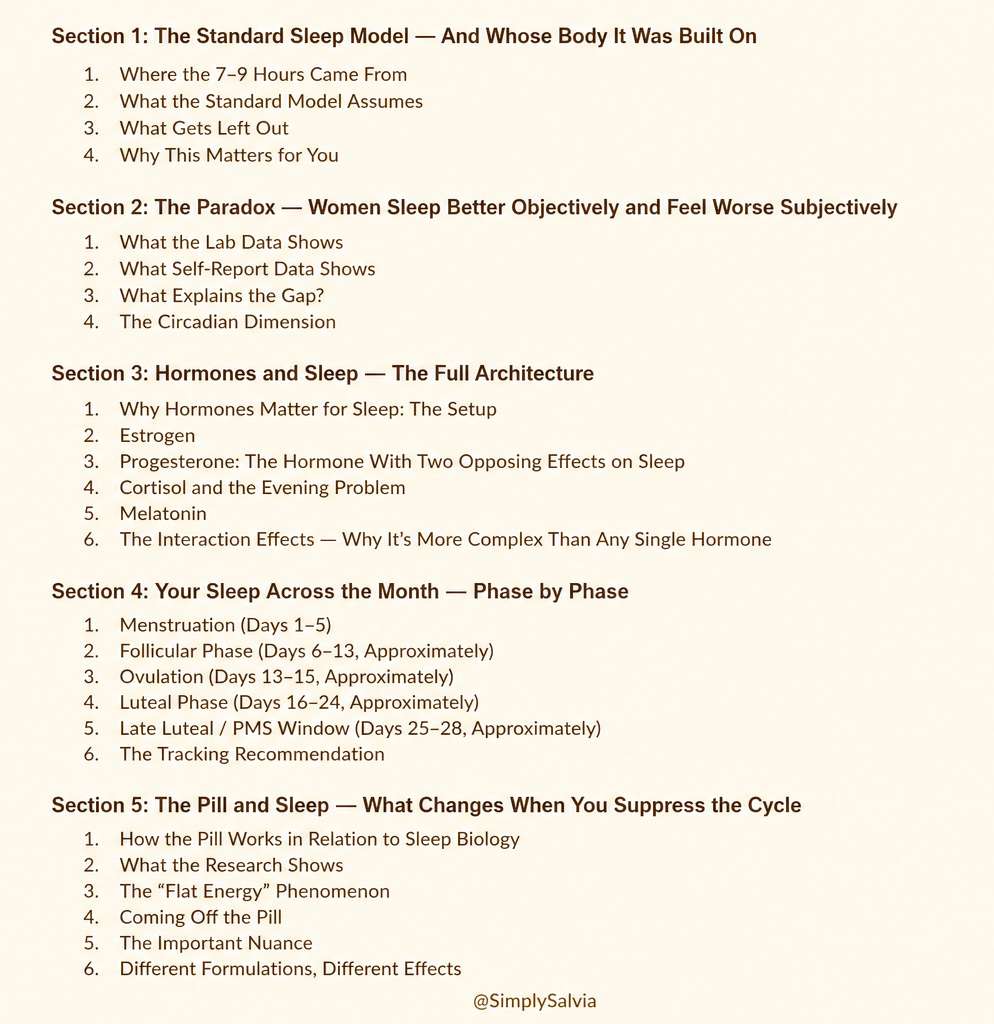 This Deep Dive is the answer to that question. Both parts, across 11 chapters, cover what the science actually says — not the simplified version that ends up in sleep hygiene articles, but the research on female sleep architecture, on how hormones interact with sleep, on how your sleep changes across the month in ways most people never have a framework for.