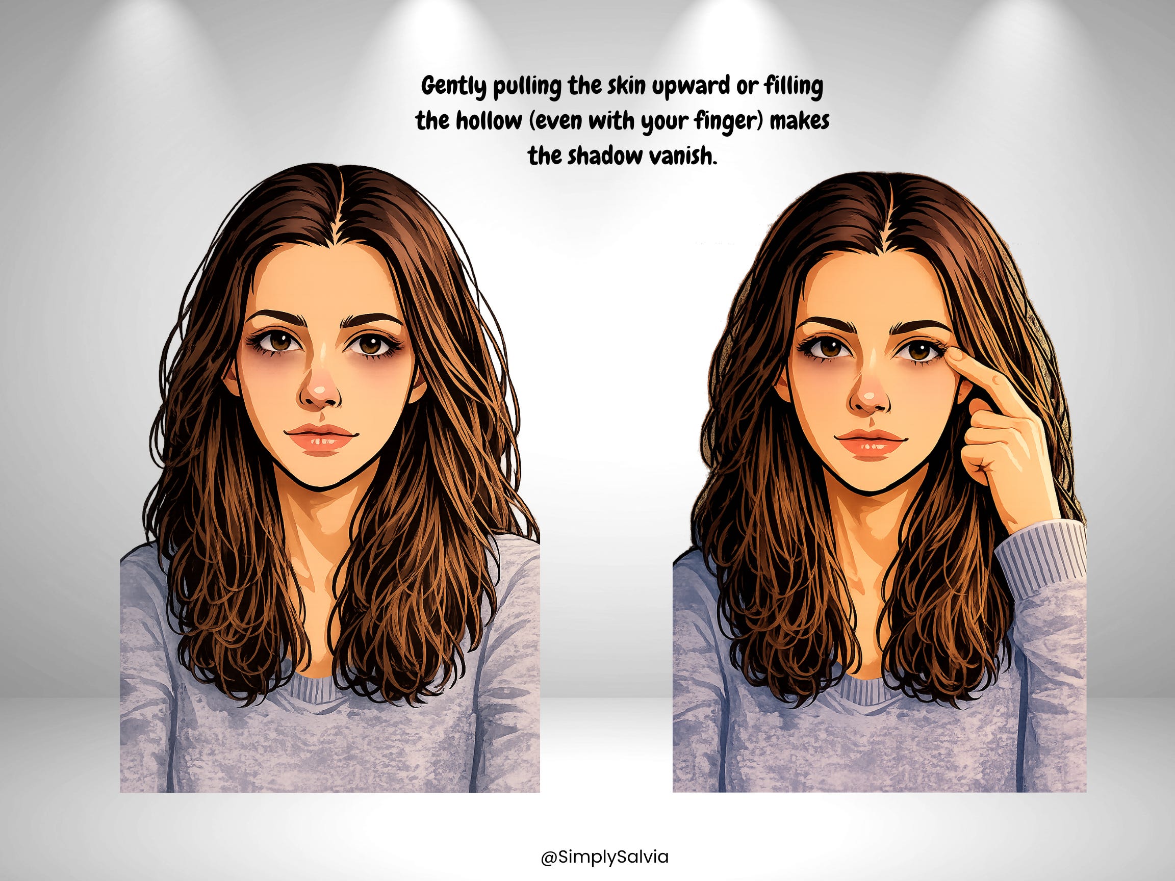 Structural Dark Circles (Shadow-based). Here, the dark “circle” is not from color in the skin at all, but from a shadow. This happens due to the contour of your face. The classic example is a deep tear trough or hollowness under the eye – the inward depression causes a shadow under the lower eyelid, giving the illusion of a dark half-circle. Another example is eye bags that create a shadow beneath them (the bulge of a bag can cast darkness below it). Structural circles are usually worse on one side or at certain angles of lighting. If you tilt your head or change the light and the darkness disappears or moves, that’s a clue it’s a shadow. Another test: gently pulling the skin upward or filling the hollow (even with your finger) makes the shadow vanish. In young people, structural circles can be due to genetics (deep-set eyes). In older folks, it’s often due to volume loss, atrophy of fat and thinning skin with age leads to that sunken look. Treatments here aim to change the contour e.g., filler injections to plump the hollow, or simply using creams that plump/hydrate can give a temporary improvement. In makeup terms, this is where a concealer (which literally “conceals” the shadow by reflecting light) helps a lot.