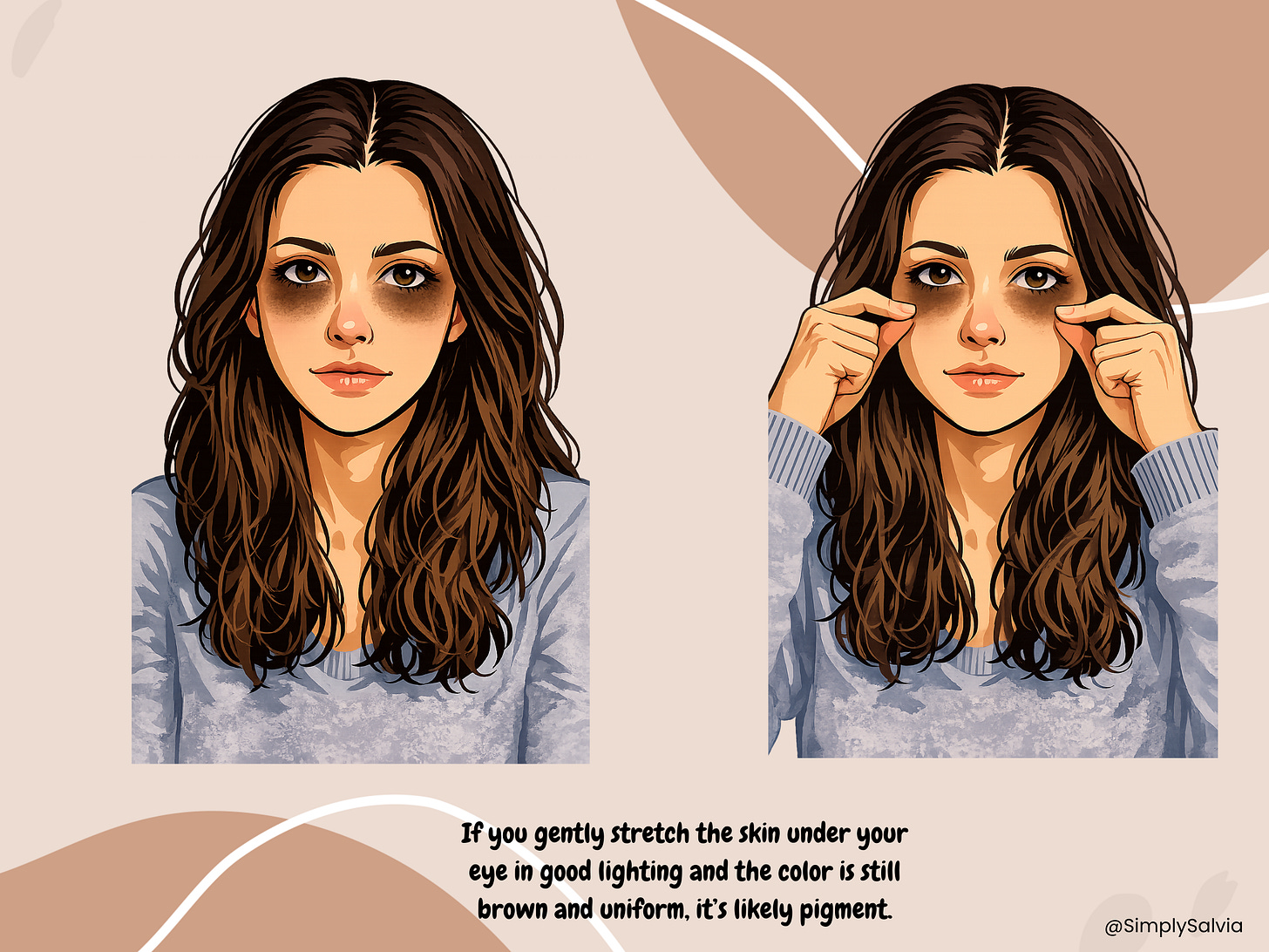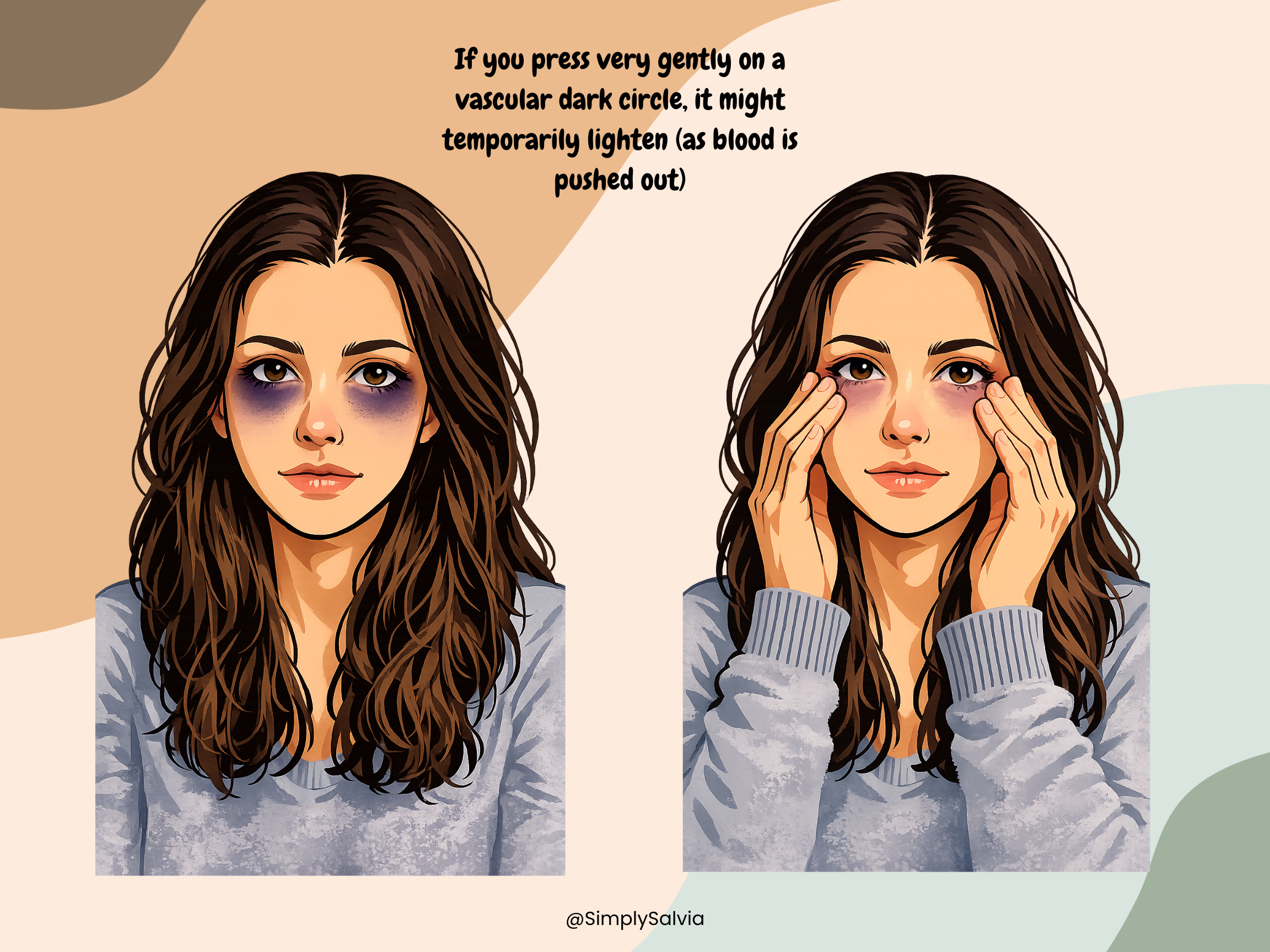 Vascular Dark Circles (Blue/Purple). These circles have a blue, purple, or even pink hue, and often the color may look worse in certain lighting or after certain activities (like after crying or upon waking). They are due to blood vessels and blood under the skin. Because under-eye skin is so thin, the deoxygenated blood (which is bluish) in the veins can show through. If you press very gently on a vascular dark circle, it might temporarily lighten (as blood is pushed out) don’t do this too hard though! Vascular circles can also become more noticeable during menstruation or if you’re lying down (more blood pooling). People with allergies often have vascular circles. If your circles improve significantly with cold compresses or worsen after a salty meal (both affecting blood vessels), the vascular component is likely. These are the ones that respond well to things like cold tea bags or caffeine eye creams (which constrict blood vessels). When the lower eyelid skin is stretched, a purely vascular circle might spread out and look lighter (whereas a pigmented one remains the same color).
