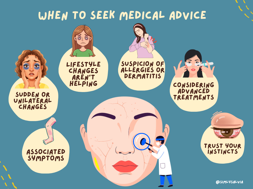 I’ve emphasized natural, holistic approaches and for the majority, those will greatly help or even resolve under-eye concerns. However, sometimes dark circles or puffiness persist despite your best efforts. Or they might appear very suddenly. It’s important to know when to consult a healthcare professional or dermatologist. Here are some scenarios where medical advice is warranted:
