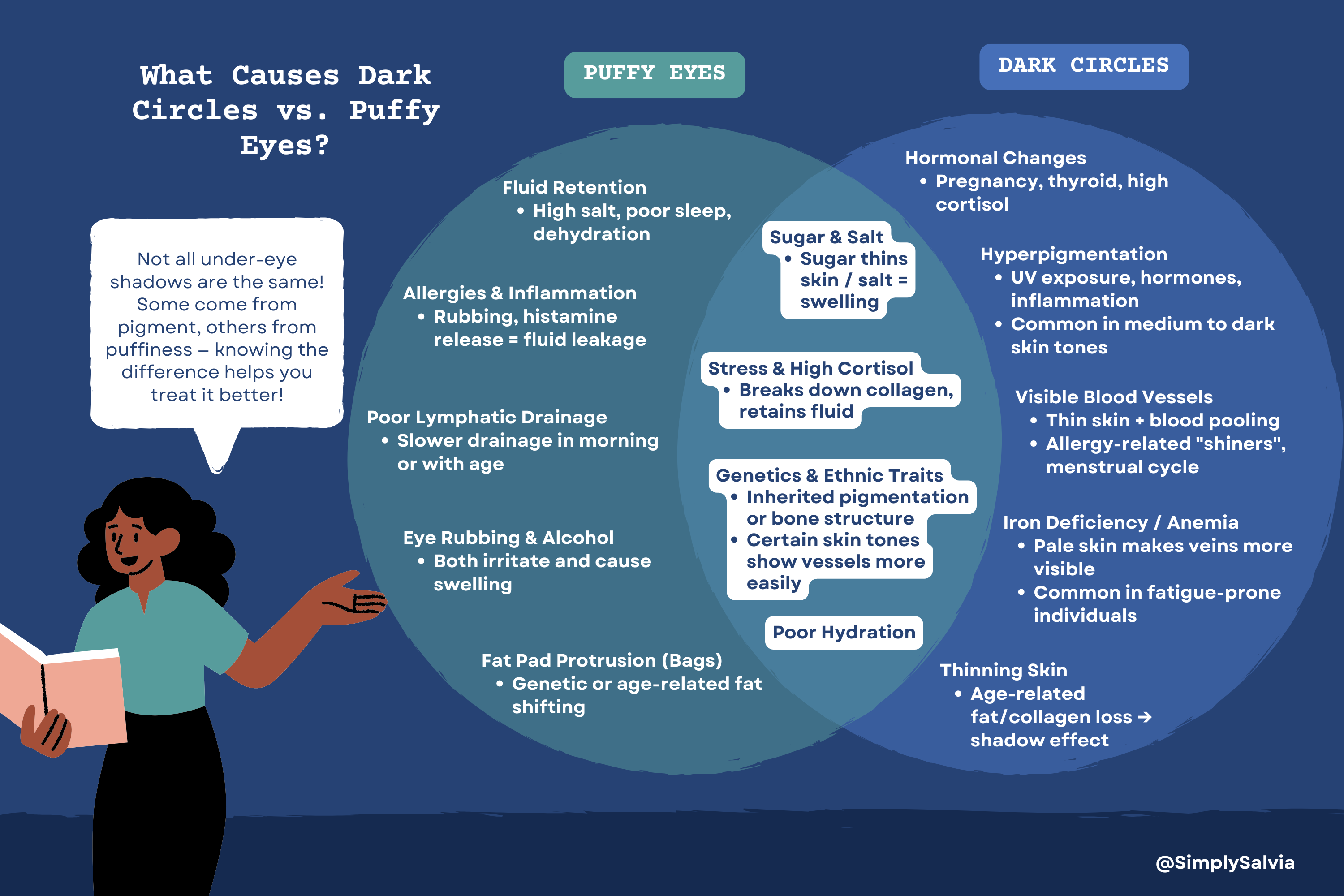 Both dark circles and puffy eyes have a variety of causes, often overlapping. Let’s break them down into two categories (dark circle causes vs. puffiness causes), and then note the common triggers they share.