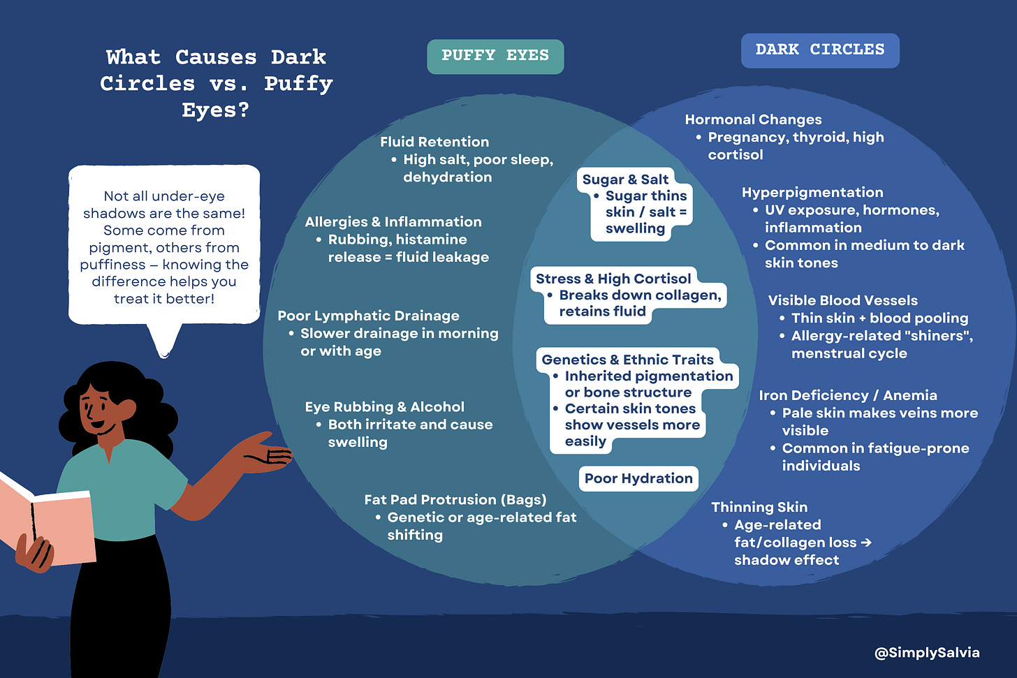 In summary, dark circles are usually a pigmentation or visibility issue (seeing what’s beneath the skin), and puffy eyes are a swelling or structural issue. But they often overlap. A night of poor sleep might give you both: dilated blood vessels (dark bluish circles) and fluid retention (morning puffiness). Conversely, someone could have chronic bags from fat pads but no discoloration, or brown pigmentation but no swelling. Understanding exactly what you’re seeing under your eyes, whether it’s true pigmentation, a shadow from a hollow, or pooled fluid is the first step in addressing it. In the next chapter, I’ll delve into the many causes behind these pesky under-eye changes.