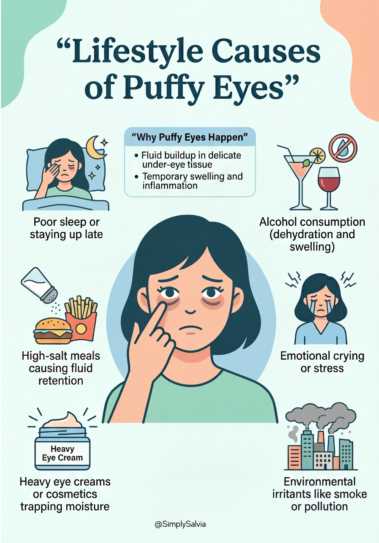 Ever wake up with a puffy face after a salty meal or a good cry? The thin tissue around the eyes easily accumulates fluid. Eating a high-sodium diet causes the body to retain water, which can pool under the eyes overnight, leading to that “morning puffiness.” Dehydration can paradoxically cause puffiness too – when you don’t drink enough water, your body holds on to fluids, and eyes can look swollen. Poor sleep is another factor: lack of sleep can disrupt the balance of hormones that regulate water in the body, and you might see puffier eyes (and often darker circles) after insomnia. Sleeping position matters as well: if you sleep flat on your back or stomach, fluid can collect under the eyes due to gravity. That’s why elevating your head can help (I’ll discuss in remedies).