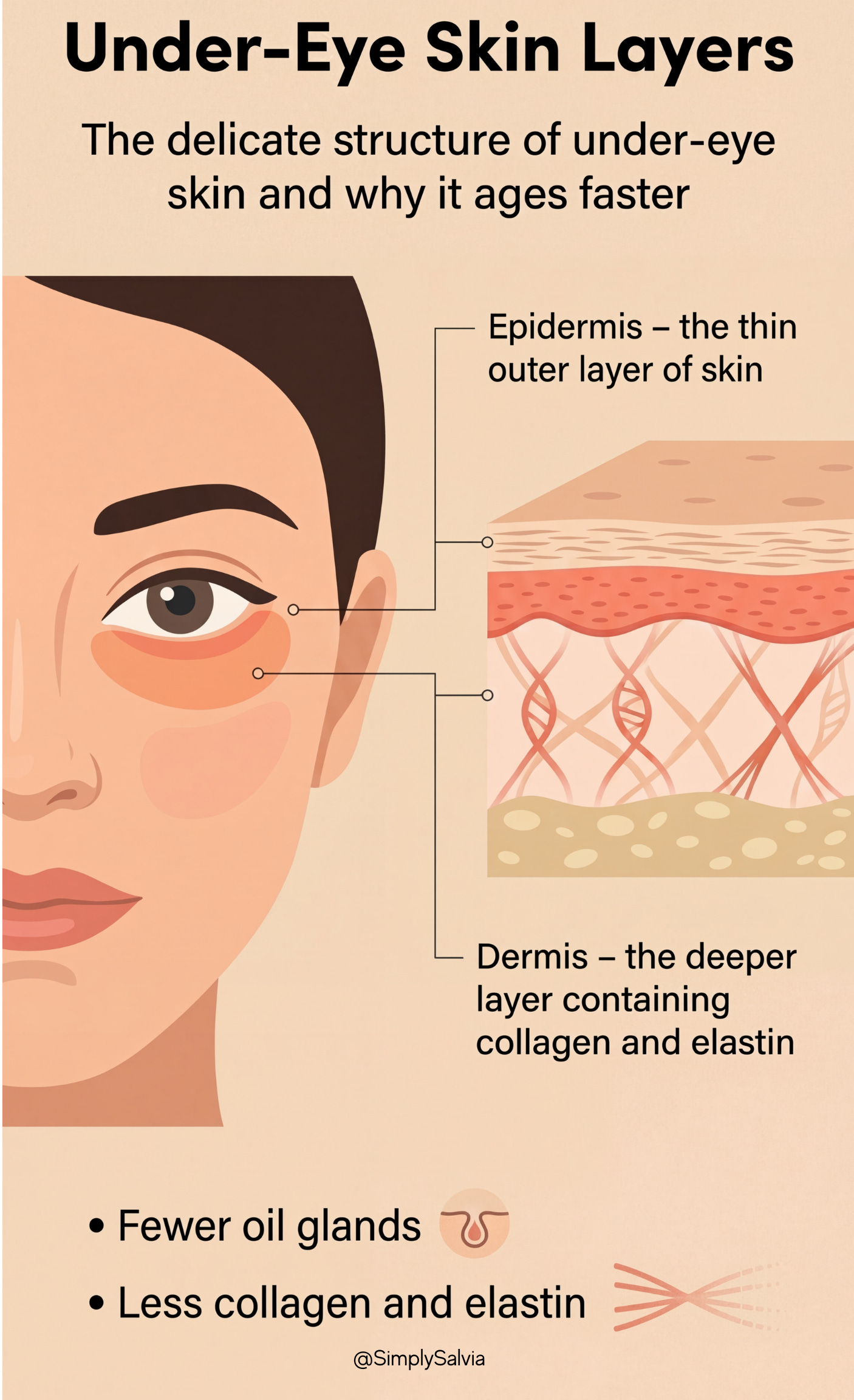 First, the skin here is extremely thin. In fact, it’s one of the thinnest areas of skin on the entire body. It also contains less collagen and elastin, the proteins that normally keep skin firm and resilient. On top of that, the under-eye area has fewer oil glands, which means it dries out more easily and doesn’t have the same natural protection as other parts of your face.