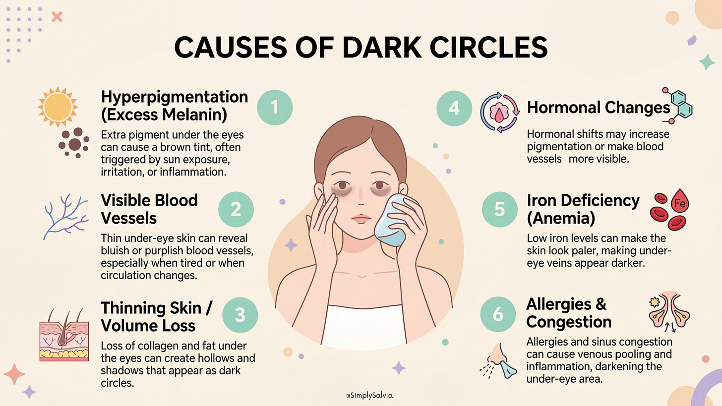 What’s actually happening anatomically under that thin, overexposed skin. The real reasons dark circles form and not just “you’re tired” but the six distinct causes, from iron deficiency to venous pooling to genetics playing a hand you didn’t ask for. And which type you’re actually dealing with, because a brownish pigmented circle and a blue vascular one and a structural shadow are three completely different problems, and treating one with the other’s solution gets you nowhere.