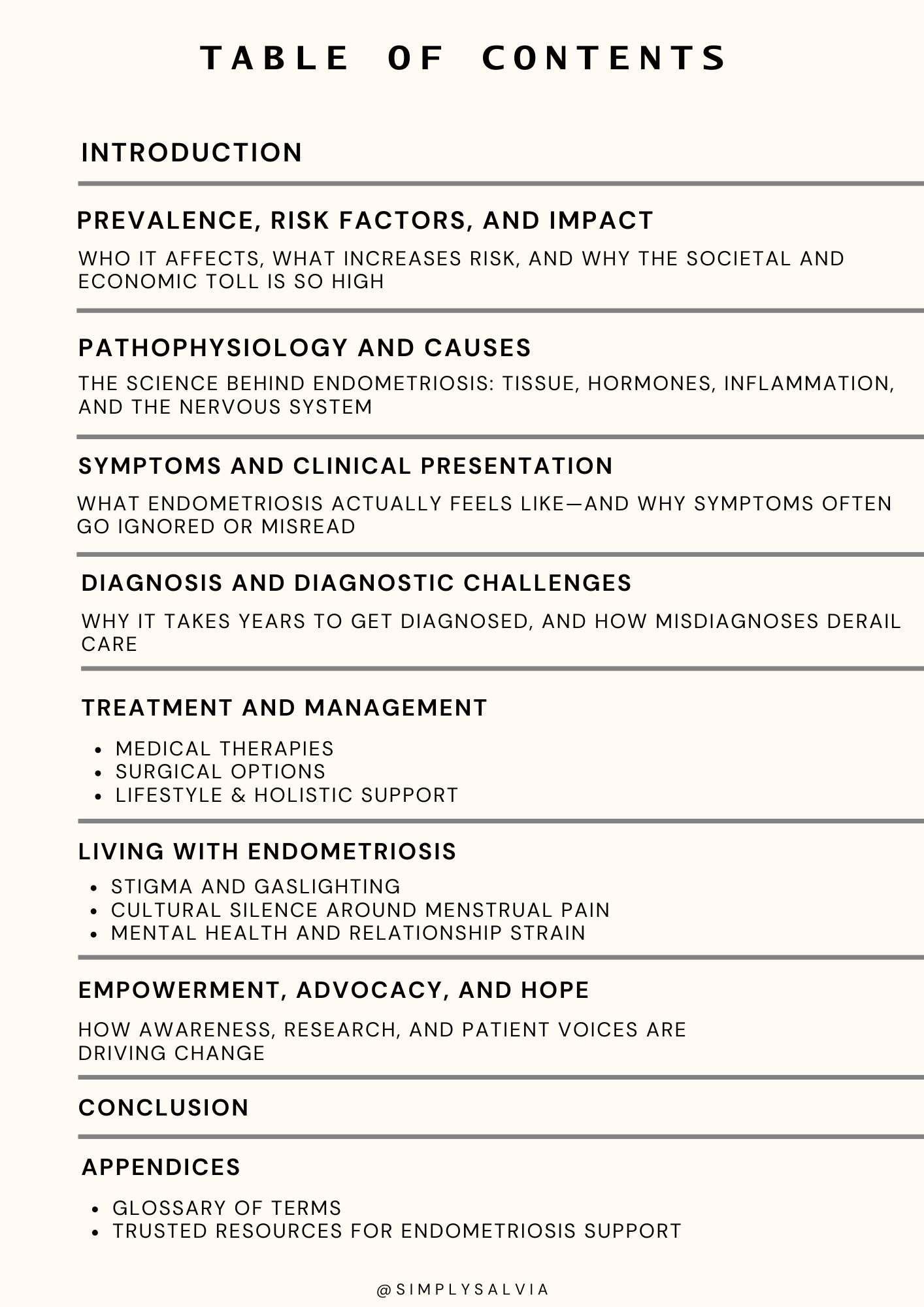 In this in-depth short dive, I move beyond surface-level definitions to offer a deeply researched, yet reader-friendly look at endometriosis from every angle: biology, diagnosis, treatment, emotional impact, and lived experience. With data, case studies, and expert insights, this resource is written for patients, loved ones, and anyone who wants to understand why endometriosis deserves more attention—and what can be done to change the narrative.